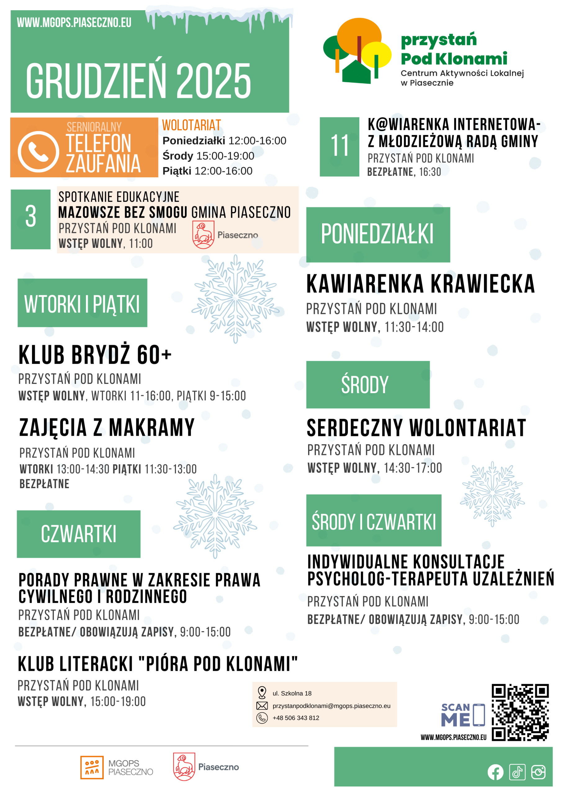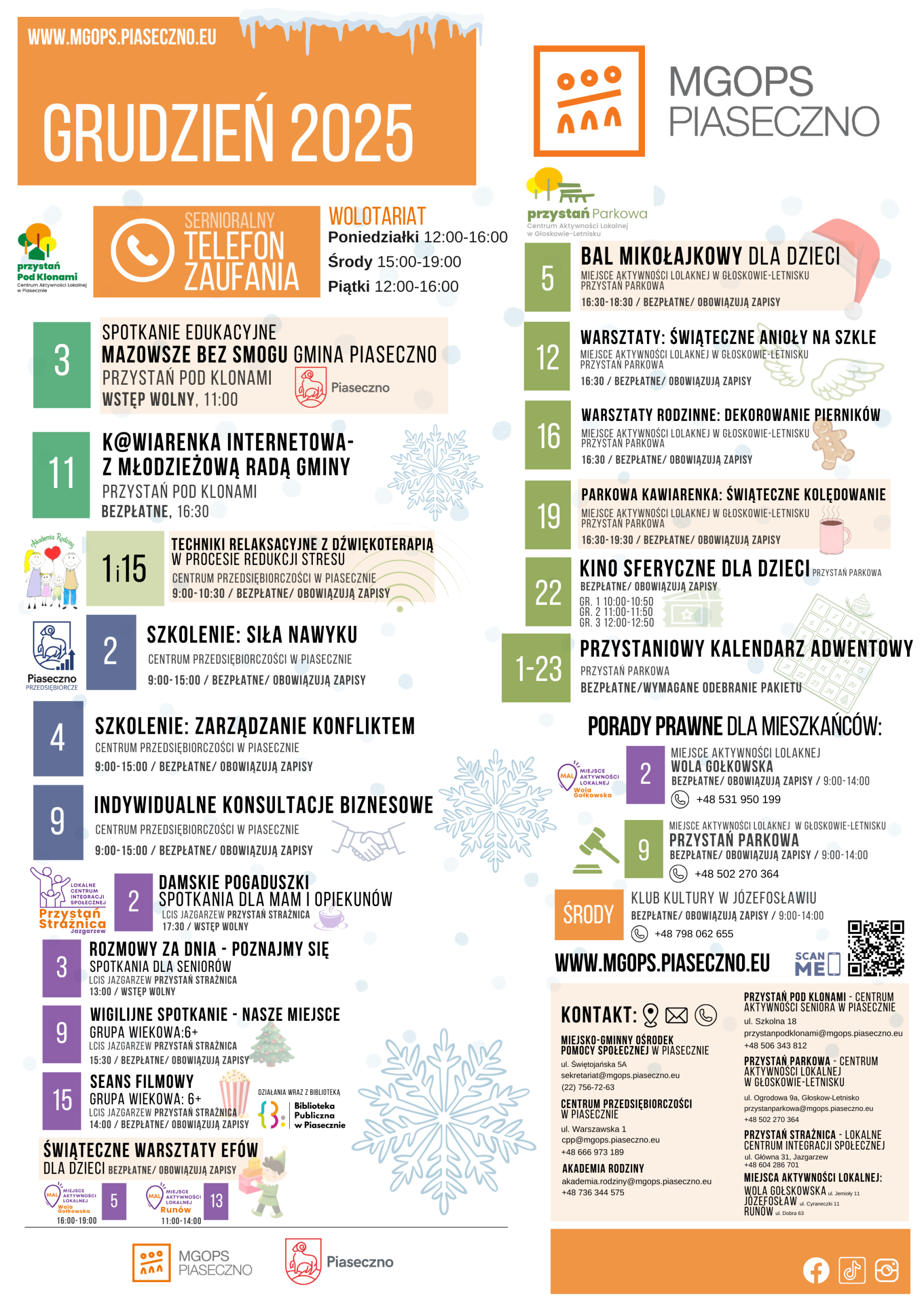 Miejsko-Gminny Ośrodek Pomocy Społecznej w Piasecznie (MGOPS, Centrum Przedsiębiorczości, Przystań Pod Klonami, Akademia Rodziny, Miejsca Aktywności Lokalnej) przygotował kalendarium wydarzeń, które zaplanowali na grudzień 2025 roku.