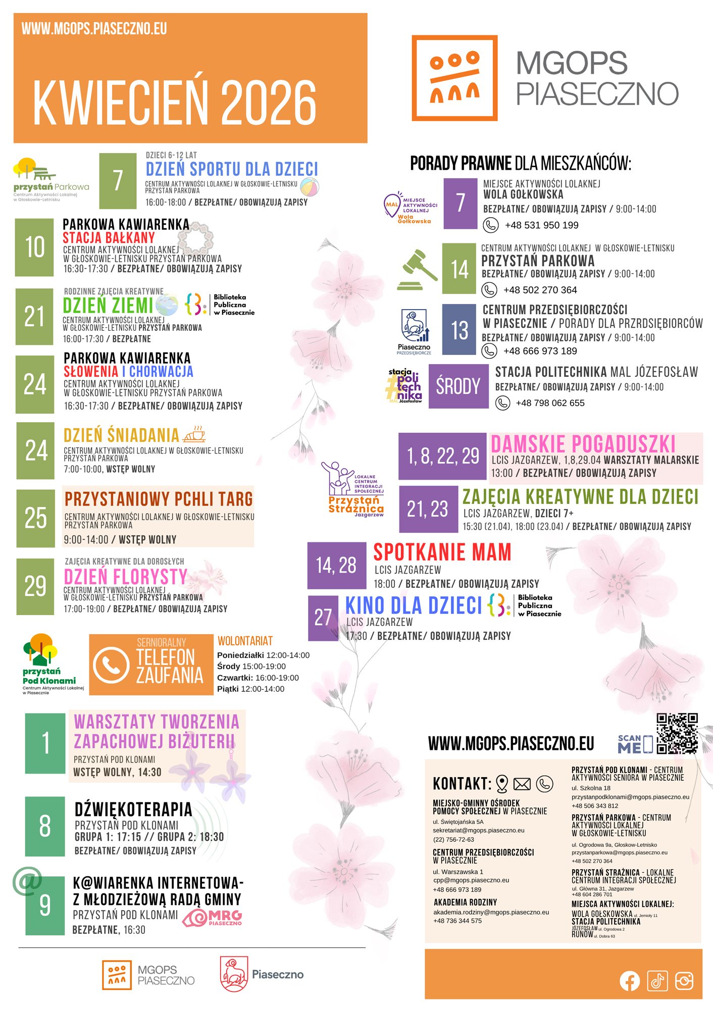 Miejsko-Gminny Ośrodek Pomocy Społecznej w Piasecznie (MGOPS, Centrum Przedsiębiorczości, Przystań Pod Klonami, Akademia Rodziny, Miejsca Aktywności Lokalnej, Stacja Politechnika) przygotował kalendarium wydarzeń, które zaplanowali na kwiecień 2026 roku.