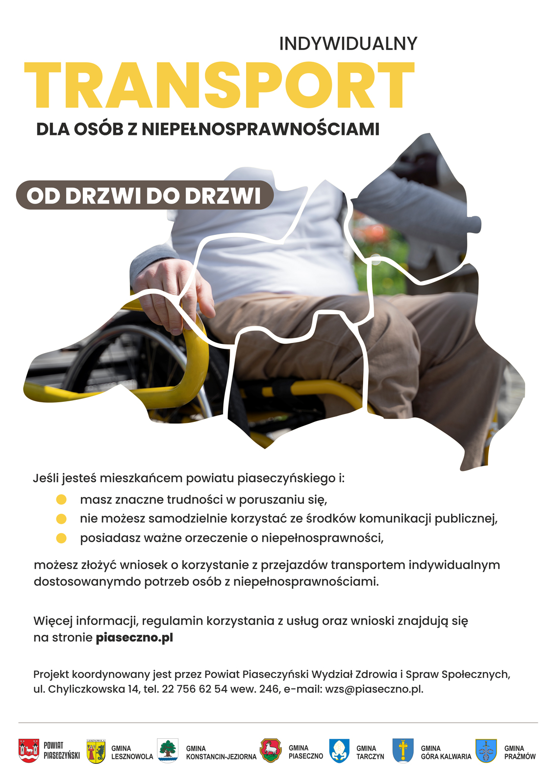Dzięki współpracy Powiatu Piaseczyńskiego oraz gmin: Piaseczno, Góra Kalwaria, Konstancin-Jeziorna, Lesznowola, Prażmów oraz Tarczyn został sfinansowany i uruchomiony transport na rzecz osób z niepełnosprawnościami w 2025 roku.