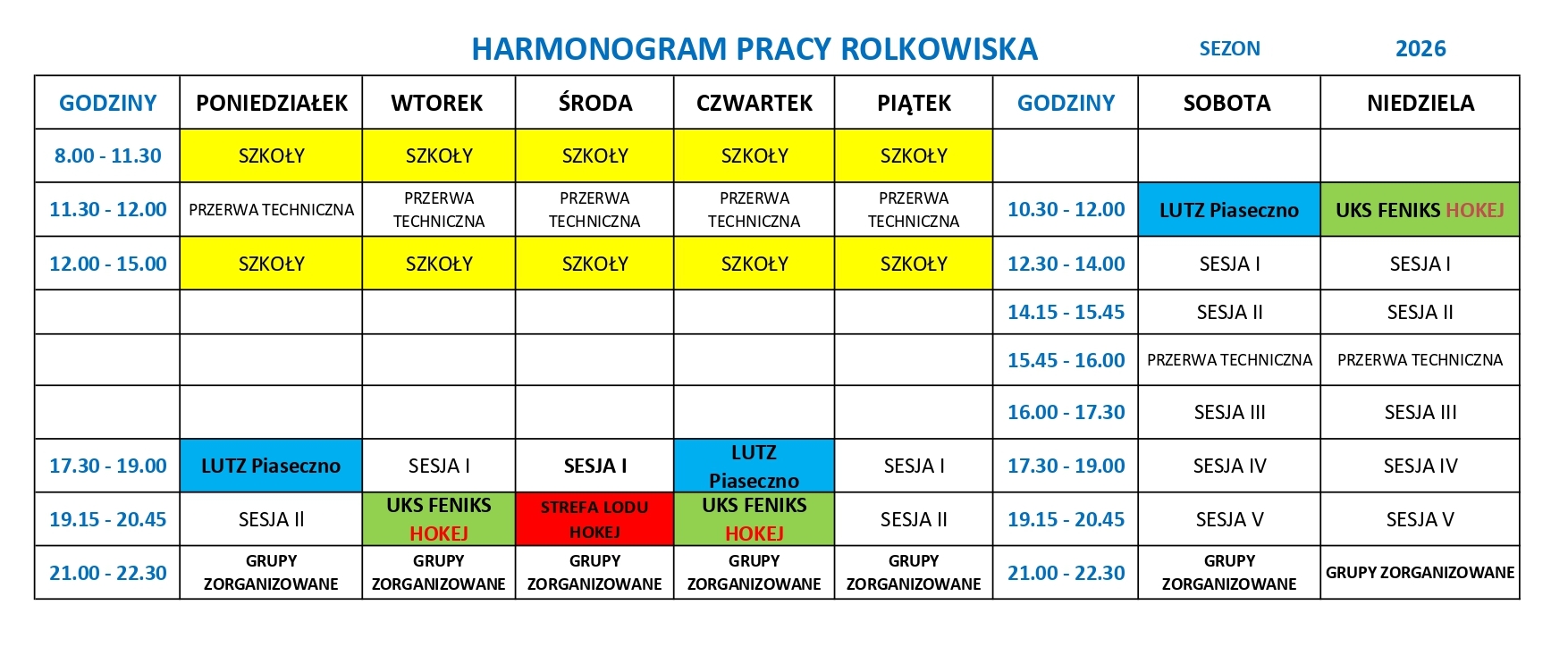 Harmonogram rolkowiska w sezonie 2026