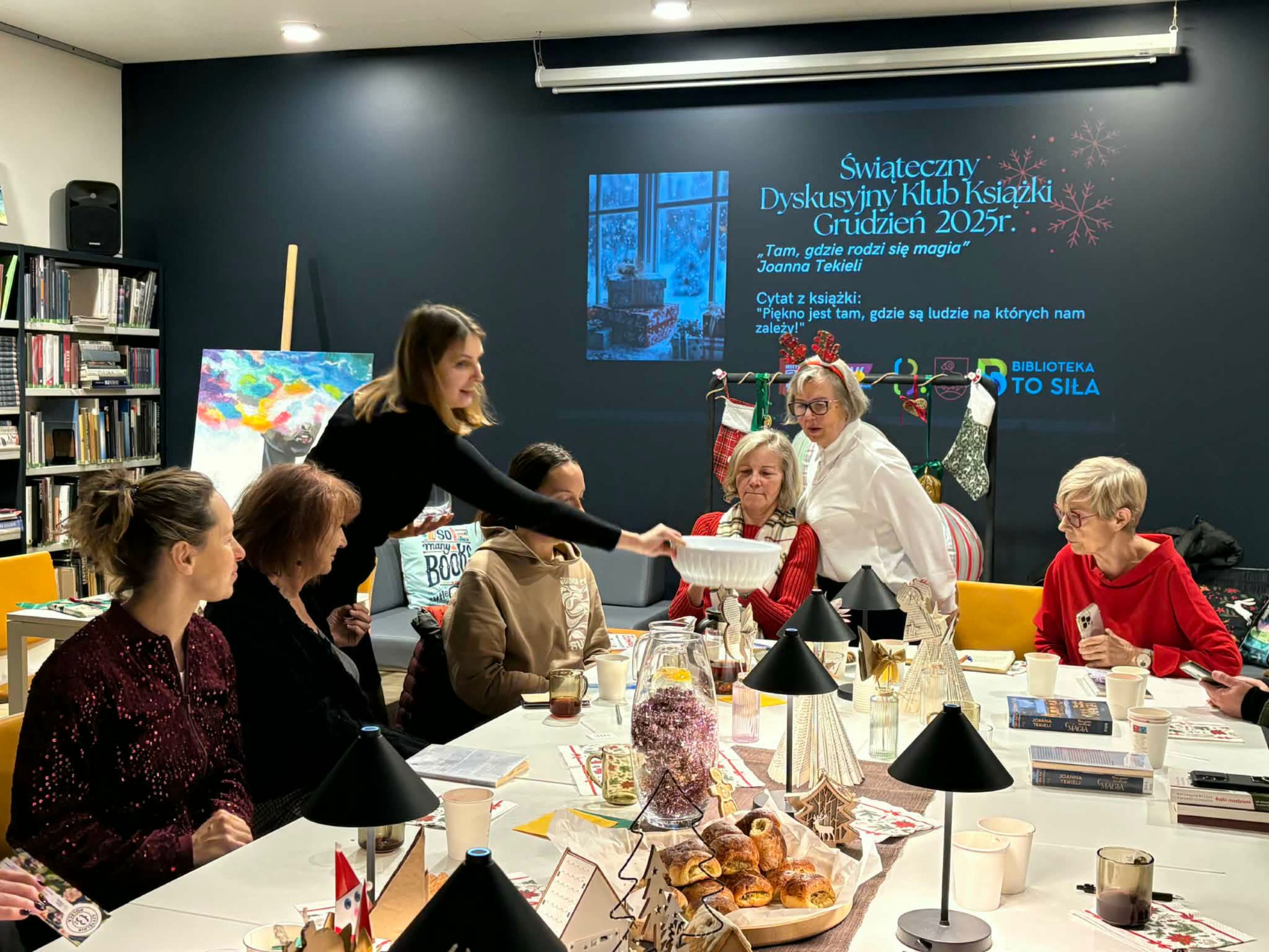 Spotkanie miało świąteczny, przytulny i kameralny charakter. Na uczestniczki czekał świąteczny poczęstunek oraz symboliczne upominki, które dopełniły atmosfery ciepła i wspólnego celebrowania literatury.