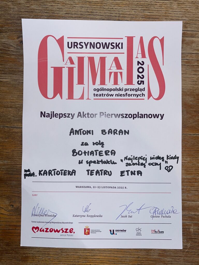W miniony weekend teatr Etna reprezentował Piaseczno na Ogólnopolskim Festiwalu Galimatias . Spośród 36 zgłoszonych grup organizatorzy wybrali 11, które prezentowały się na scenie DOK Ursynów przez 3 dni.  Etna otrzymała nagrodę główną,  czyli Złoty Galimatias, a Antonii Baran po raz kolejny został uhonorowany nagrodą aktorską. GRATULACJE!