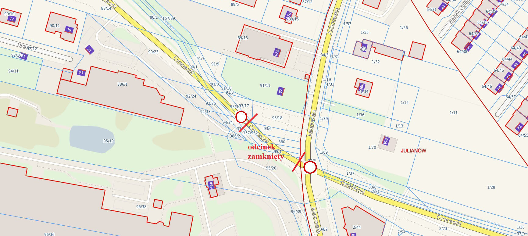 Od piątku, 20 marca 2026 roku, wprowadzona zostaje czasowa organizacja ruchu (nr IRD.7123.691.cz.2025). Najważniejszą zmianą jest zamknięcie zachodniego wlotu ul. Cyraneczki do ul. Julianowskiej.