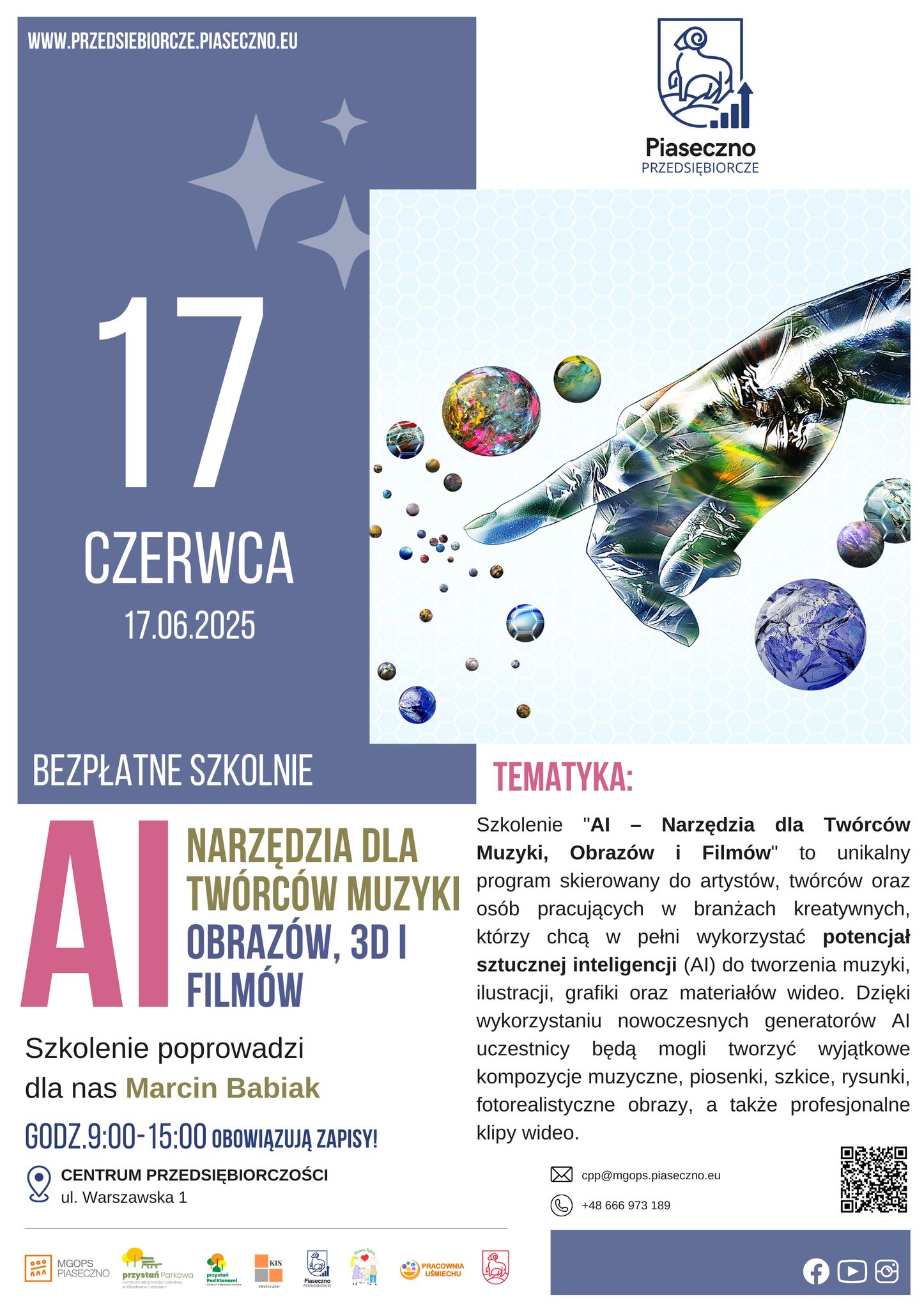 Centrum Przedsiębiorczości w Piasecznie zaprasza na bezpłatne szkolenie nt.: AI narzędzia dla twórców muzyki, obrazów, 3D i filmów, które odbędzie się 17 czerwca 2025 roku w godz. 9.00-15.00 w Centrum Przedsiębiorczości w Piasecznie ul. Warszawska 1 (wejście od strony pl. Piłsudskiego). Wstęp wolny – obowiązują zapisy.