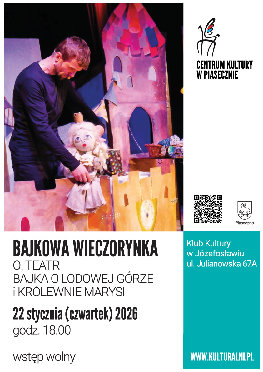 22 stycznia 2026 roku o godz. 18.00 w ramach Bajkowej Wieczorynki wystąpi O! Teatr, który przedstawi przedstawienie pt.: Bajka o lodowej górze i królewnie Marysi. Wstęp wolny. Miejsce: Józefosław, Klub Kultury, ul. Julianowska 67 A.