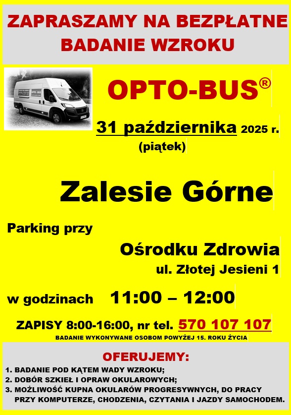 31 października 2025 roku w godz. 11.00-12.30 odbędzie się bezpłatne badanie wzroku w Zalesiu Górnym w Opto-Busie. Miejsce: Ośrodek Zdrowia ul. Złotej Jesieni 1, Zalesie Górne.