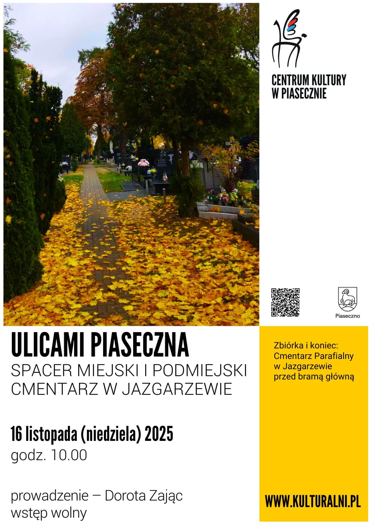 16 listopada 2025 roku o godz. 10.00 zapraszamy na cykl Ulicami Piaseczna Spacer Miejski i Podmiejski. Tematem spotkania będzie cmentarz w Jazgarzewie. Wstęp wolny. Prowadzenie Dorota Zając. Zbiórka i koniec: Cmentarz Parafialny w Jazgarzewie przed bramą główną.