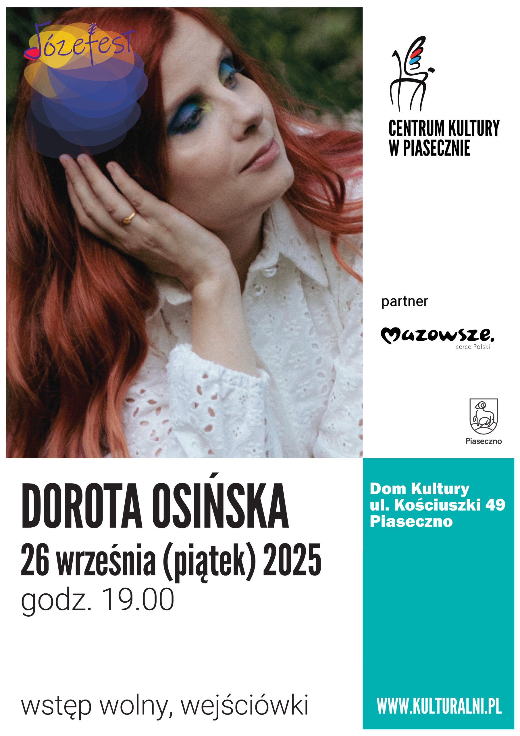 26 września 2025 roku o godz. 19.00 w ramach cyklu Józefest 2025 zapraszamy na koncert Doroty Osińskiej. Miejsce: Dom Kultury, ul. Kościuszki 49 w Piasecznie. Wstęp wolny (wejściówki)!