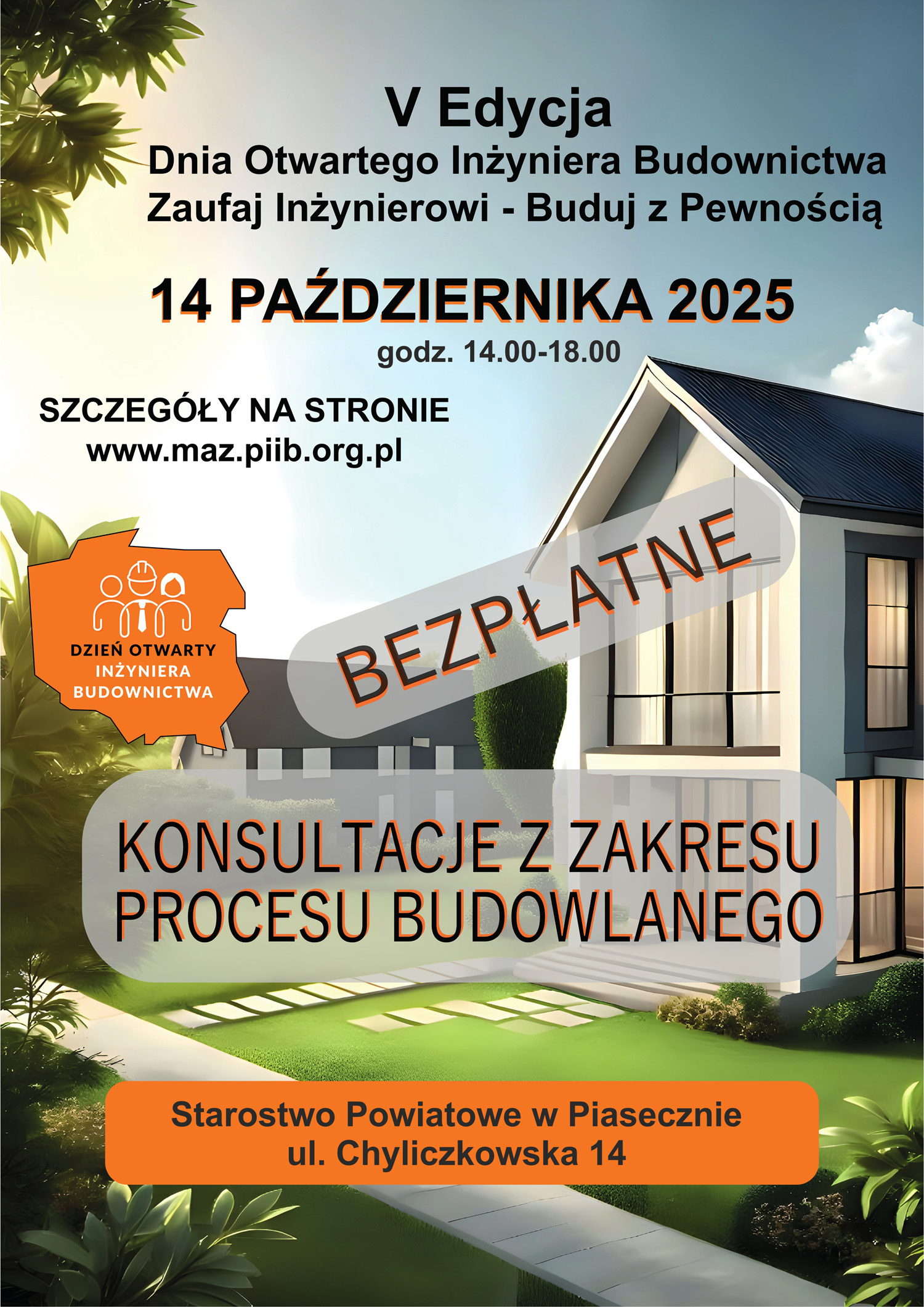 14 października 2025 roku w Starostwie Powiatowym w Piasecznie po raz piąty odbędzie się Dzień Otwarty Inżynierów Budownictwa. Bezpłatne konsultacje zostaną przeprowadzone w godzinach 14.00-18.00.