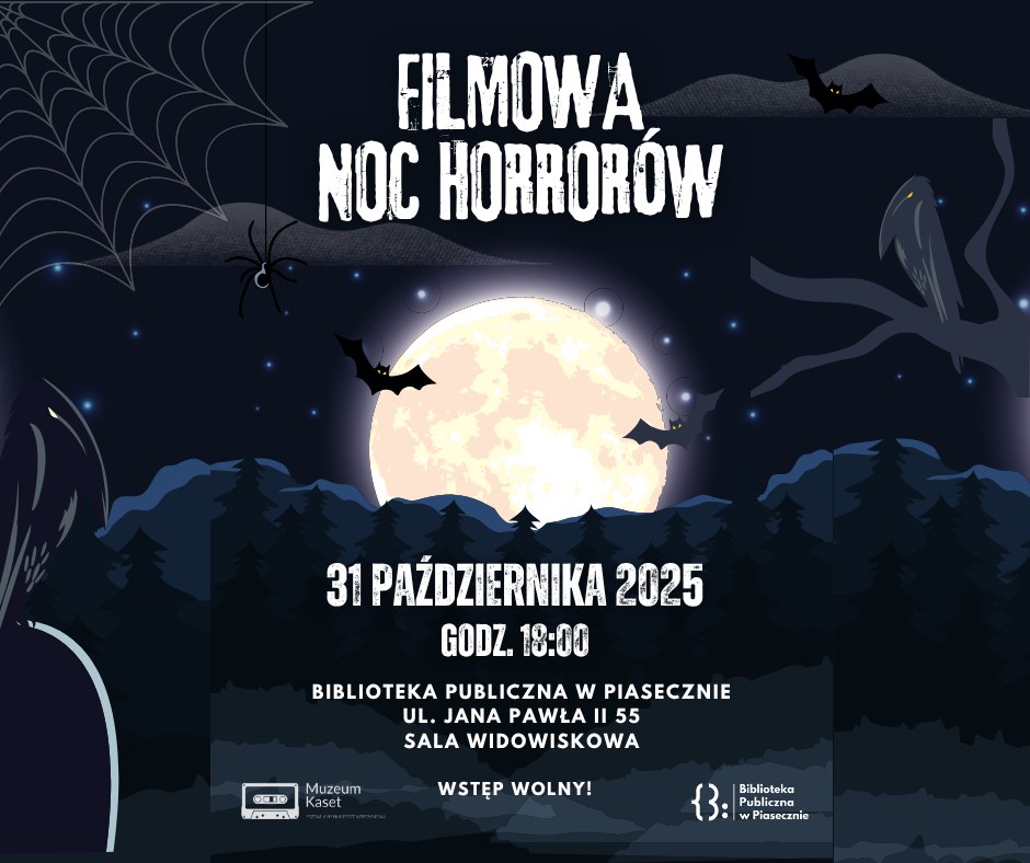 Biblioteka Publiczna w Piasecznie i Muzeum Kaset zapraszają na filmową noc grozy. Podczas seansu wyświetlone będą najsłynniejsze filmy na podstawie znanych powieści grozy. Zbierzcie ze sobą przekąski.