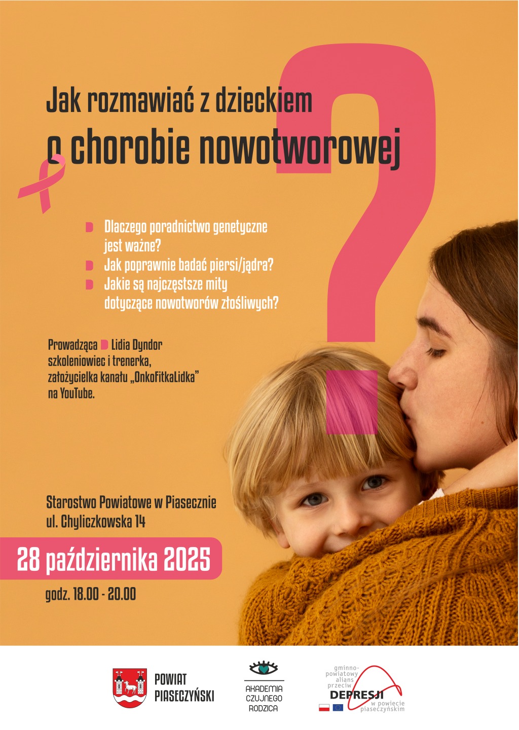 Pod koniec października – miesiąca świadomości raka piersi – serdecznie zapraszamy na kolejne spotkanie w ramach Akademii Czujnego Rodzica, które tym razem odbędzie się pod hasłem „Jak rozmawiać z dzieckiem o chorobie nowotworowej”. Spotkanie odbędzie się 28 października 2025 roku o godzinie 18.00 w sali konferencyjnej Starostwa Powiatowego w Piasecznie ul. Chyliczkowska 14. Wstęp wolny. Zapraszamy!