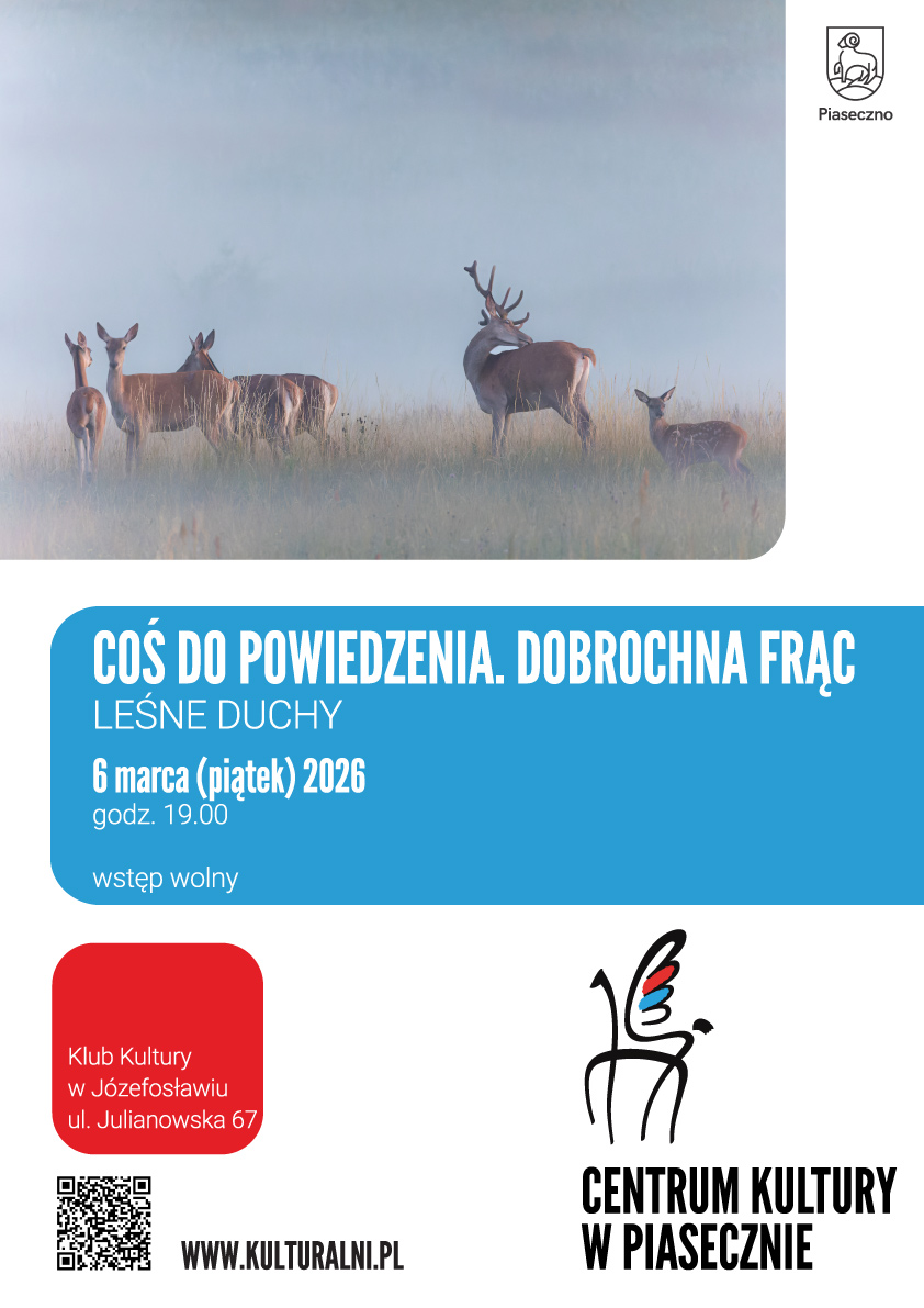 6 marca 2026 roku o godz. 19.00 zapraszamy na spontanie Leśne duchy Dobrochna Frąc. Wstęp wolny. Miejsce: Klub Kultury w Józefosławiu, ul. Julianowska 67 A.