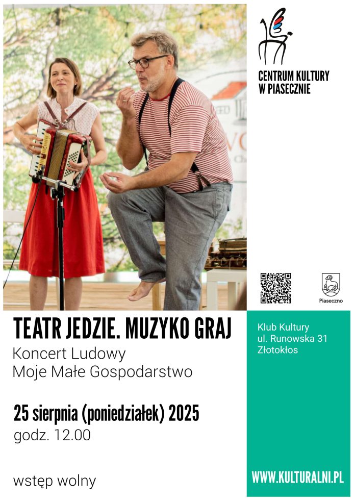 25 sierpnia 2025 roku o godz. 12.00 zapraszamy na koncert ludowy pt.: Moje małe gospodarstwo, w wykonaniu Teatru Jedzie. Muzyko Graj. Wstęp wolny. Miejsce: Klub Kultury w Złotokłosie, ul. Runowska 31.