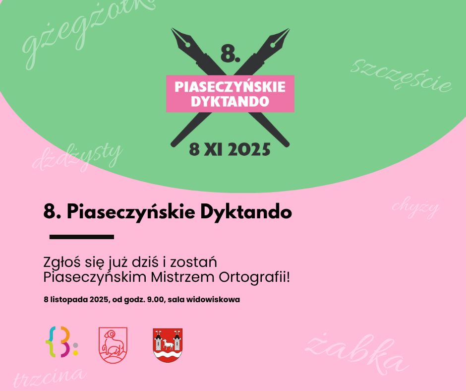 Biblioteka Publiczna w Piasecznie zaprasza do udziału w językowym wyzwaniu wszystkich miłośników poprawnej polszczyzny z powiatu piaseczyńskiego! 8. Piaseczyńskie Dyktando odbędzie się 8 listopada 2025 roku o godz. 9.00. Miejsce: sala widowiskowa Biblioteki Głównej w CEM, ul. Jana Pawła II 55, Piaseczno.
