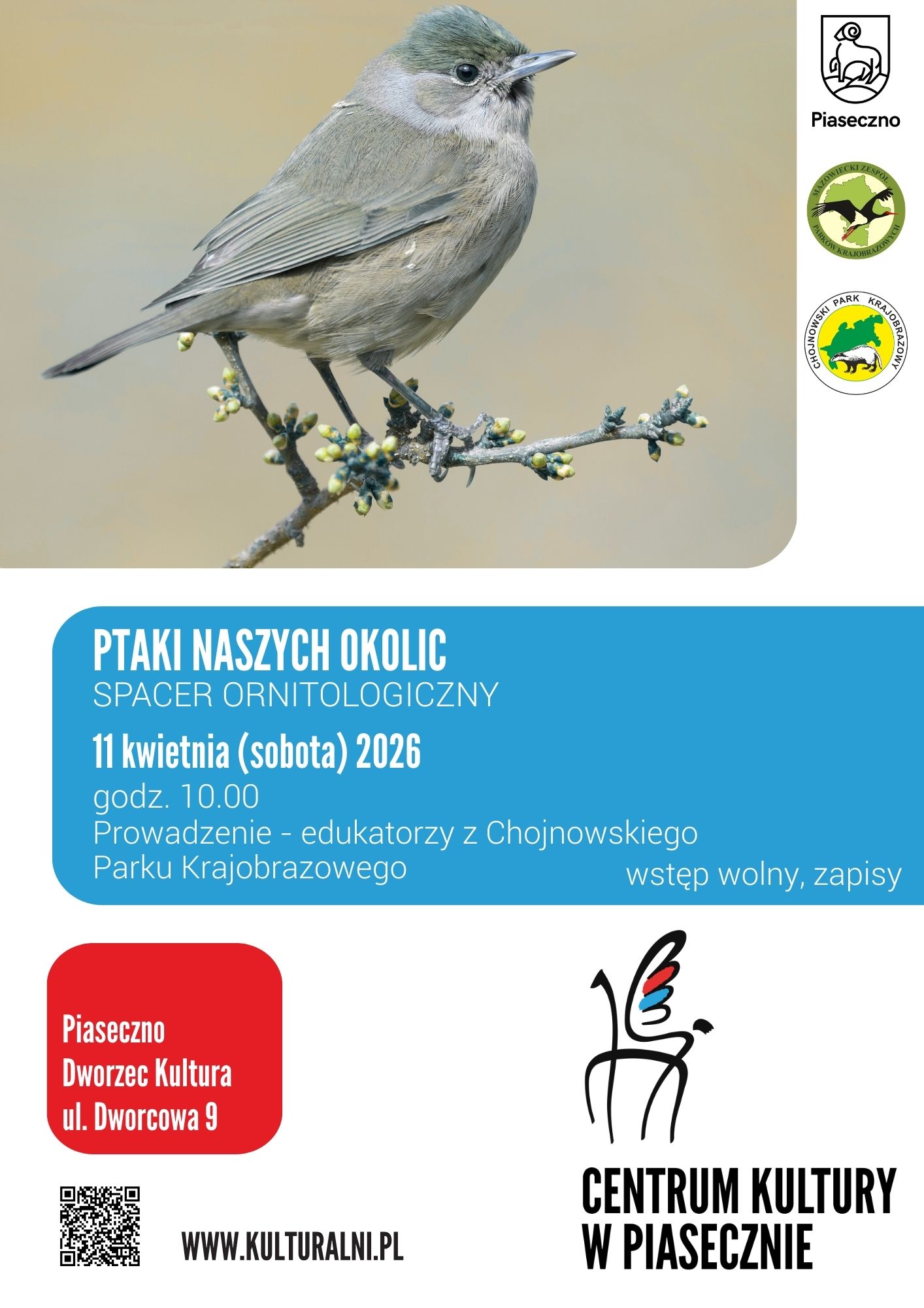 11 kwietnia 2026 roku o godz. 10.00 odbędzie się spacer ornitologiczny Ptaki Naszych Okolic. Wstęp wolny, zapisy. Prowadzenie – edukatorzy z Chojnowskiego Parku Krajobrazowego. Miejsce zbiórki, parking (przy stacji roweru miejskiego). Miejsce: Aleja Brzóz 31, Zalesie Dolne.