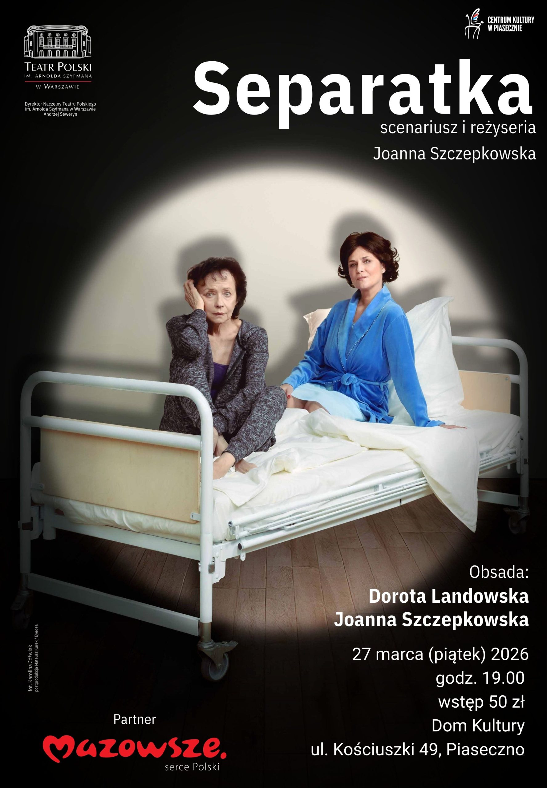 Bohaterkami sztuki Joanny Szczepkowskiej „Separatka” są dwie kobiety, które prawdopodobnie nigdy by się nie spotkały, gdyby nie przypadek. Marta i Alina trafiają do szpitalnej sali przeznaczonej dla jednej osoby. Żadna z nich nie chce ustąpić i wyjść, bo każda uważa, że to właśnie jej należy się miejsce w „jedynce”. Skazane na swoje towarzystwo – próbują przetrwać do momentu, aż ktoś przyjdzie i zdecyduje za nie. Różnice w charakterach i poglądach nie ułatwiają im czekania, prowadząc do wielkich napięć, szeregu zabawnych nieporozumień, ale też do niespodziewanych zwrotów akcji „Separatka” to komedia, z gatunku tych, co pod pozorem lekkiej formy przemycają przenikliwą prawdę o naszej rzeczywistości. W spektaklu zobaczymy Joannę Szczepkowską i Dorotę Landowską.