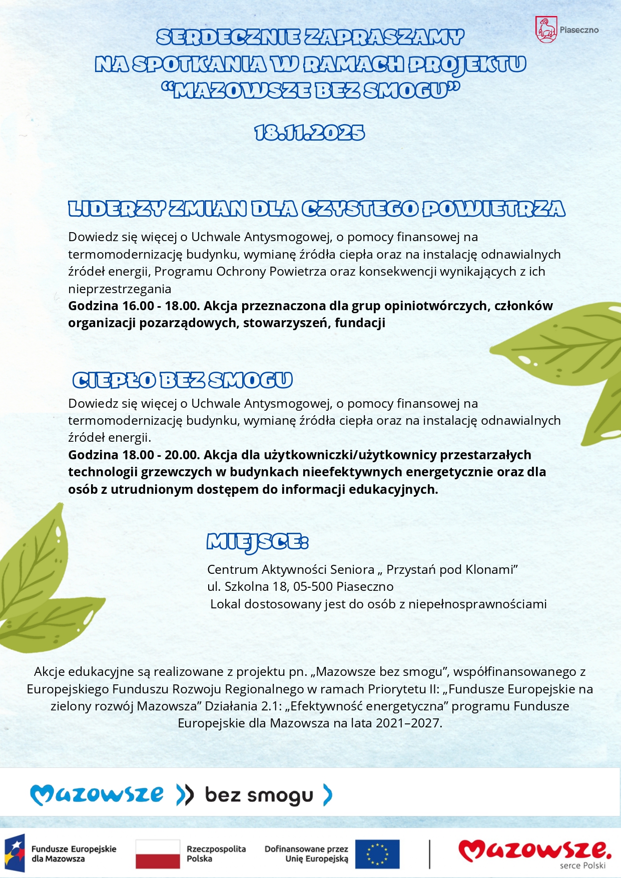 Już 18 listopada 2025 r. (wtorek) zapraszamy mieszkanki i mieszkańców Piaseczna do udziału w akcjach edukacyjnych organizowanych w ramach projektu „Mazowsze bez smogu”. Wydarzenie odbędzie się w Centrum Aktywności Seniora „Przystań pod Klonami”, przy ul. Szkolnej 18 w Piasecznie.