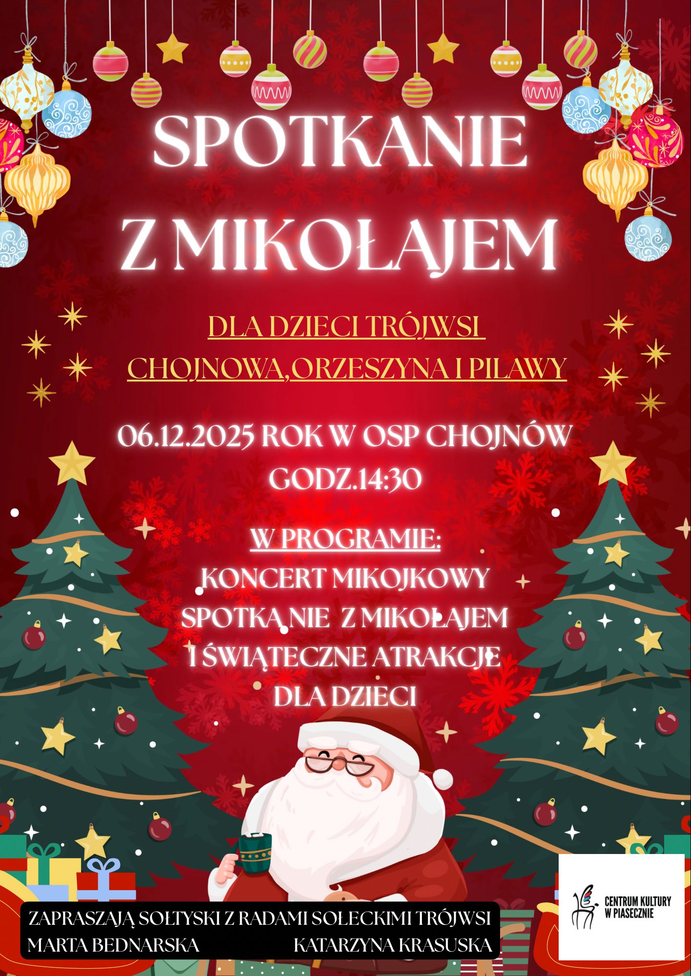 Serdecznie zapraszamy wszystkie dzieci z Trójwsi — Chojnowa, Orzeszyna i Pilawy — na wyjątkowe Spotkanie z Mikołajem, które odbędzie się 6 grudnia 2025 roku o godz. 14:30 w OSP Chojnów.
