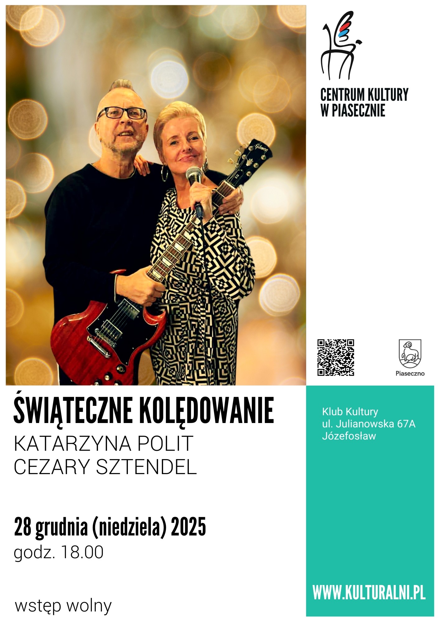 28 grudnia 2025 roku o godz. 18.00 odbędzie się Świąteczne kolędowanie, podczas którego wystąpią Katarzyna Polit i Cezary Sztendel. Wstęp wolny. Miejsce: Józefosław, Klub Kultury, ul. Julianowska 67 A.