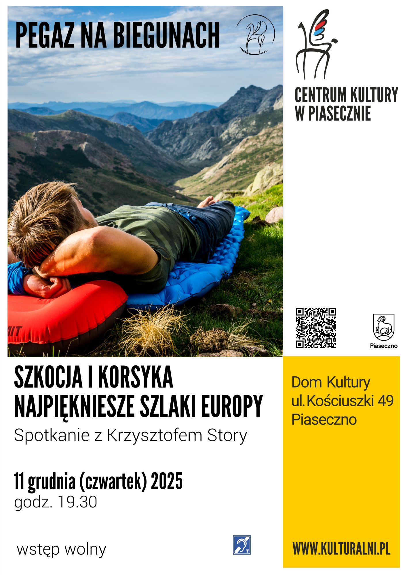 11 grudnia 2025 roku o godz. 19.30 odbędzie się spotkanie w ramach cyklu Pegaz na biegunach nt.: Szkocja i Korsyka: najpiękniejsze szlaki Europy. Wstęp wolny. Miejsce: Piaseczno, Dom Kultury, ul. Kościuszki 49.