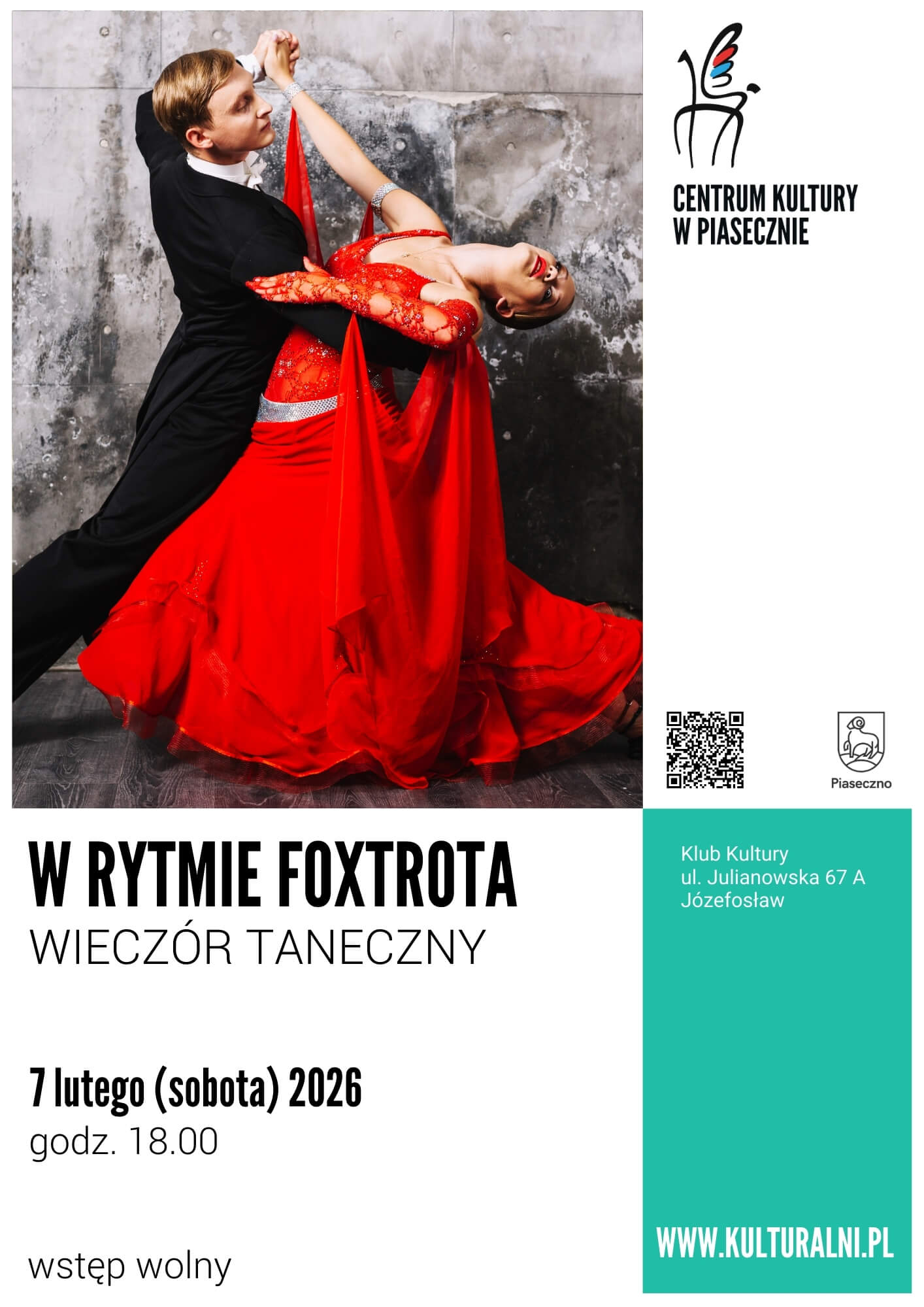 7 lutego 2026 roku o godz. 18.00 zapraszamy na Wieczór Taneczny pn.: W RYTMIE FOXTROTA. Wstęp wolny. Miejsce: Józefosław, Klub Kultury, ul. Julianowska 67A.