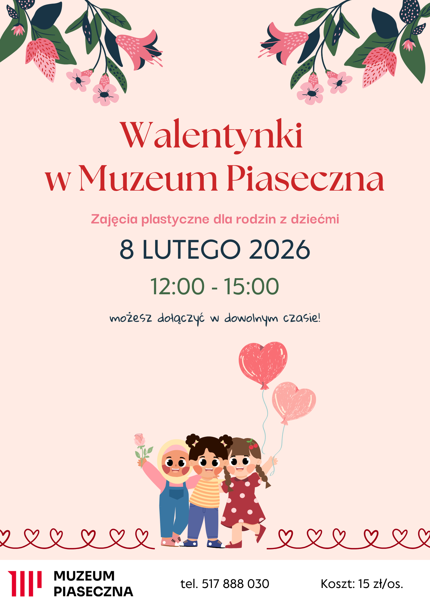 Muzeum Piaseczna w Piasecznie zaprasza na zajęcia plastyczne dla rodzin z dziećmi z okazji Walentynek, które odbędą się 8 lutego 2026 roku w godz. 12.00-15.00 (można dołączyć w dowolnym czasie). Miejsce: Muzeum Piaseczna, plac Piłsudskiego 10, Piaseczno. Bilety: 15 zł.