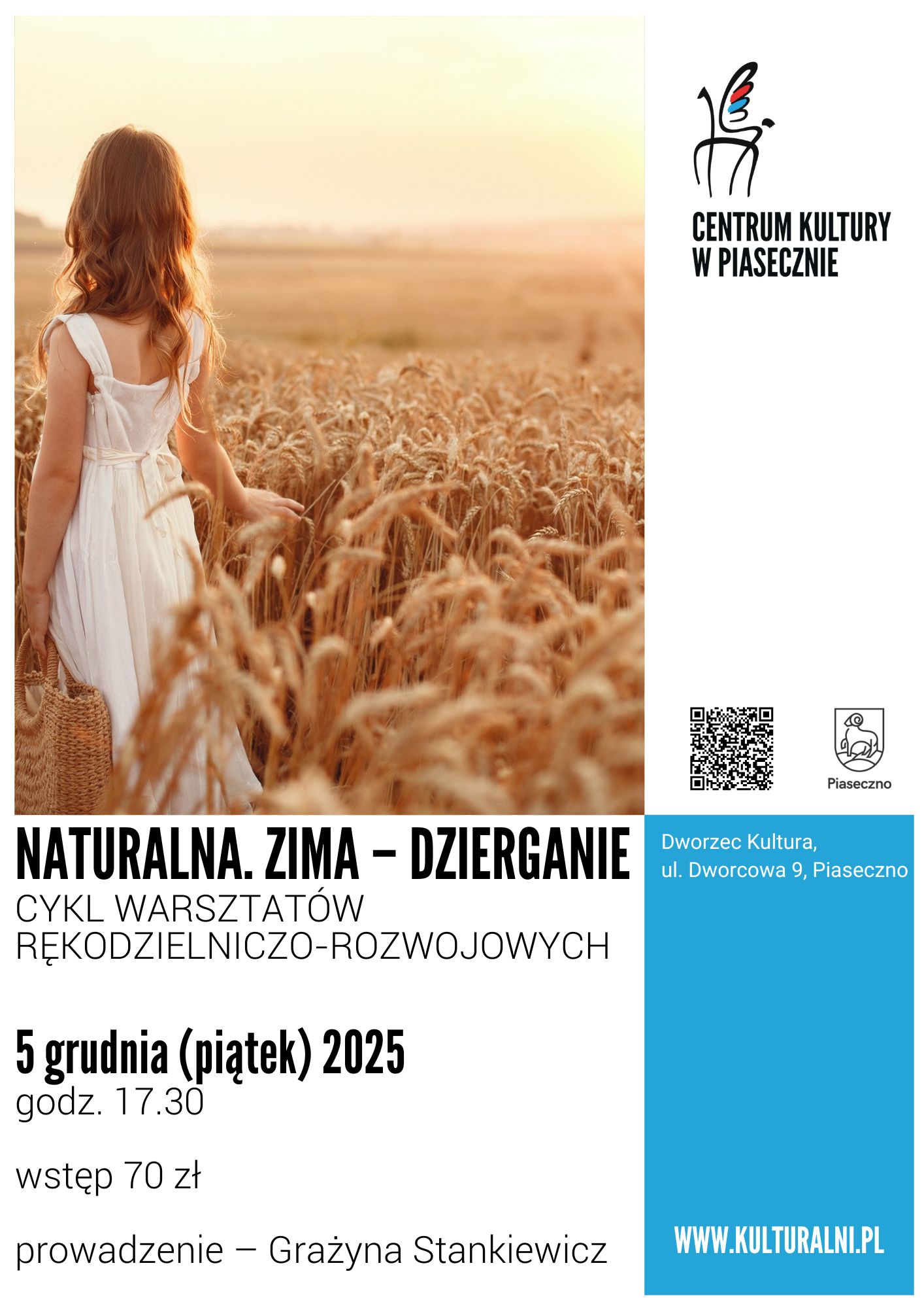 5 grudnia 2025 roku o godz. 17.30 odbędzie się cykl warsztatów rękodzielniczo-rozwojowych NATURALNA „ZIMA – DZIERGANIE”. Wstęp 70 zł. Prowadzenie Grażyna Stankiewicz. Miejsce: Piaseczno, Dworzec Kultura, ul. Dworcowa 9.