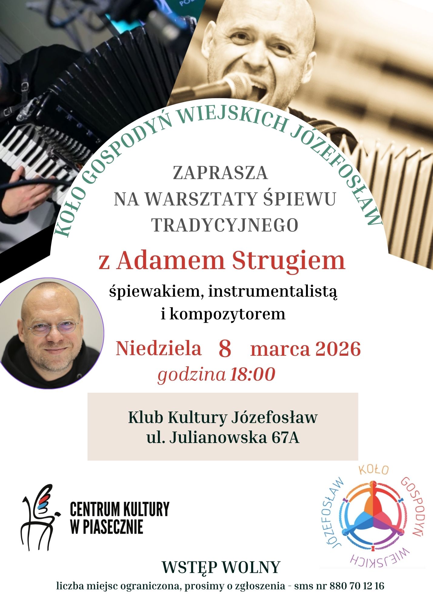 Koło Gospodyń Wiejskich Józefosław zaprasza na warsztaty śpiewu tradycyjnego z Adamem Strugiem – śpiewakiem, instrumentalistą i kompozytorem.