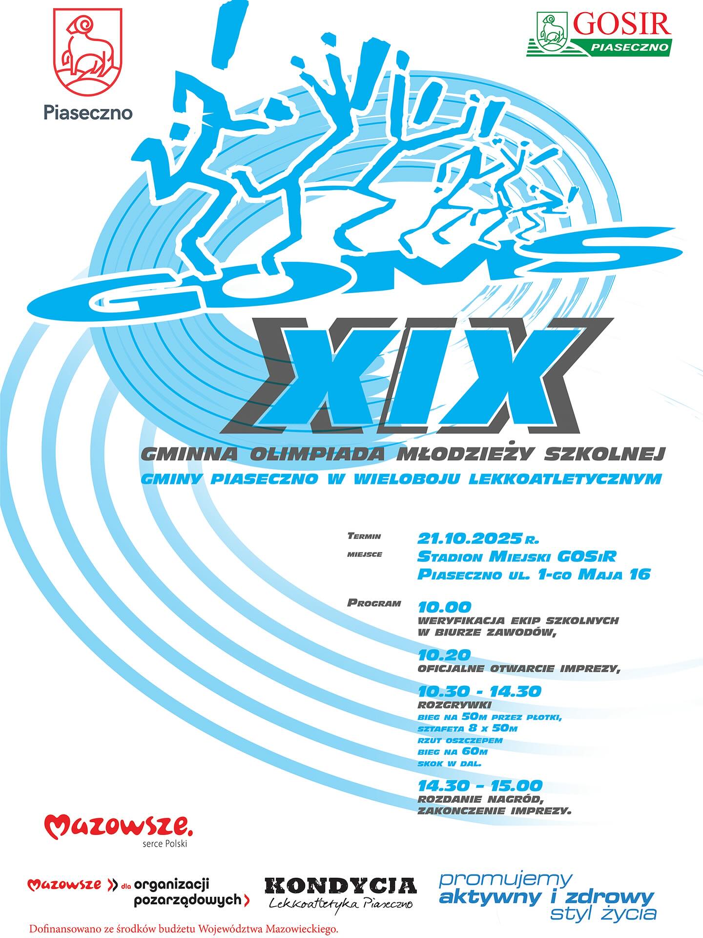 21 października 2025 roku na Stadionie Miejskim GOSiR Piaseczno (ul. 1 Maja 16) odbędzie się kolejna edycja Gminnej Olimpiady Młodzieży Szkolnej w Wieloboju Lekkoatletycznym!