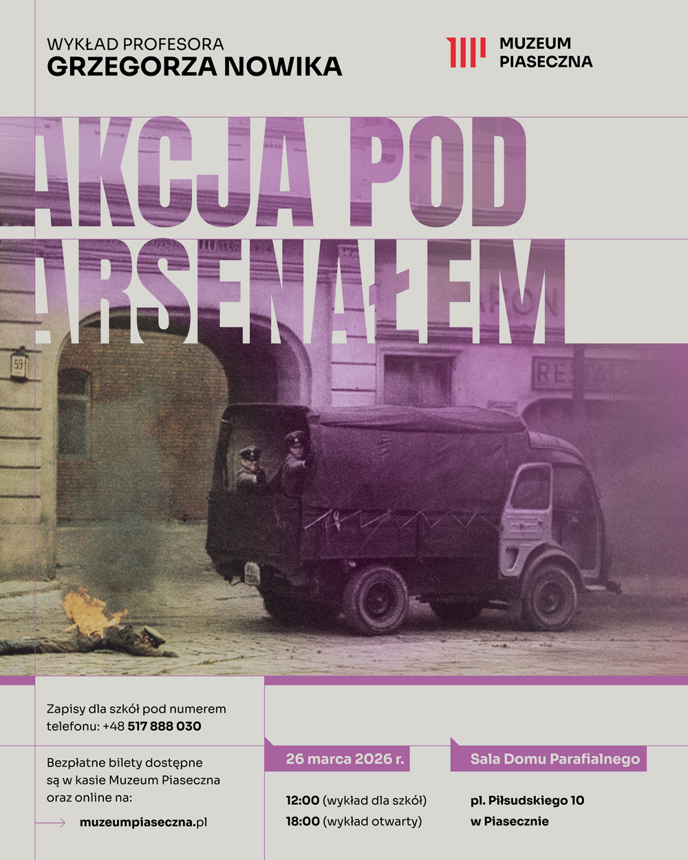 26 marca 2026 roku Muzeum Piaseczna zaprasza na wykład prof. Grzegorza Nowika poświęcony jednej z najbardziej znanych i symbolicznych akcji zbrojnych Polskiego Państwa Podziemnego – Akcji pod Arsenałem. Spotkanie odbędzie się w sali Domu Parafialnego w Piasecznie przy Placu Piłsudskiego 10 o godz. 12.00 i 18.00.